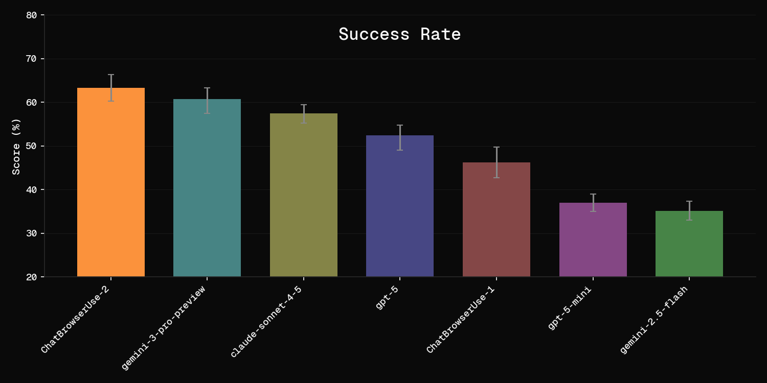 This benchmark is open source at github.com/browser-use/benchmark. We want it to be easy to use and modify. Our results for ChatBrowserUse 2 can be replicated by running run_eval.py.