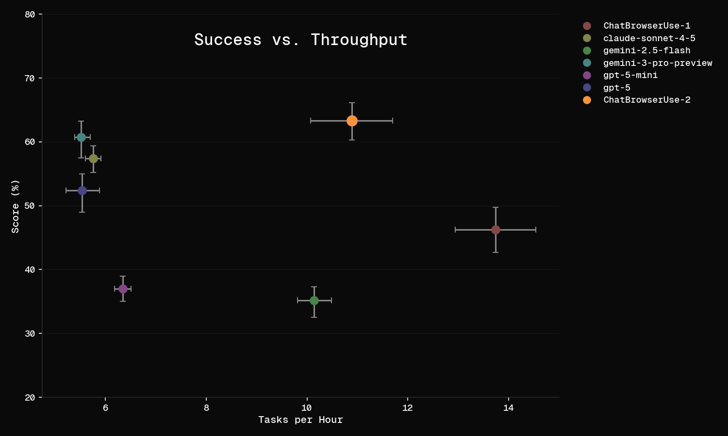 Here is a comparison of performance and throughput on this benchmark for the most used models on Browser Use Cloud. We find it concerning that many AI agent benchmarks do not include error bars or variance estimations. We have run each evaluation multiple times and shown standard error bars.